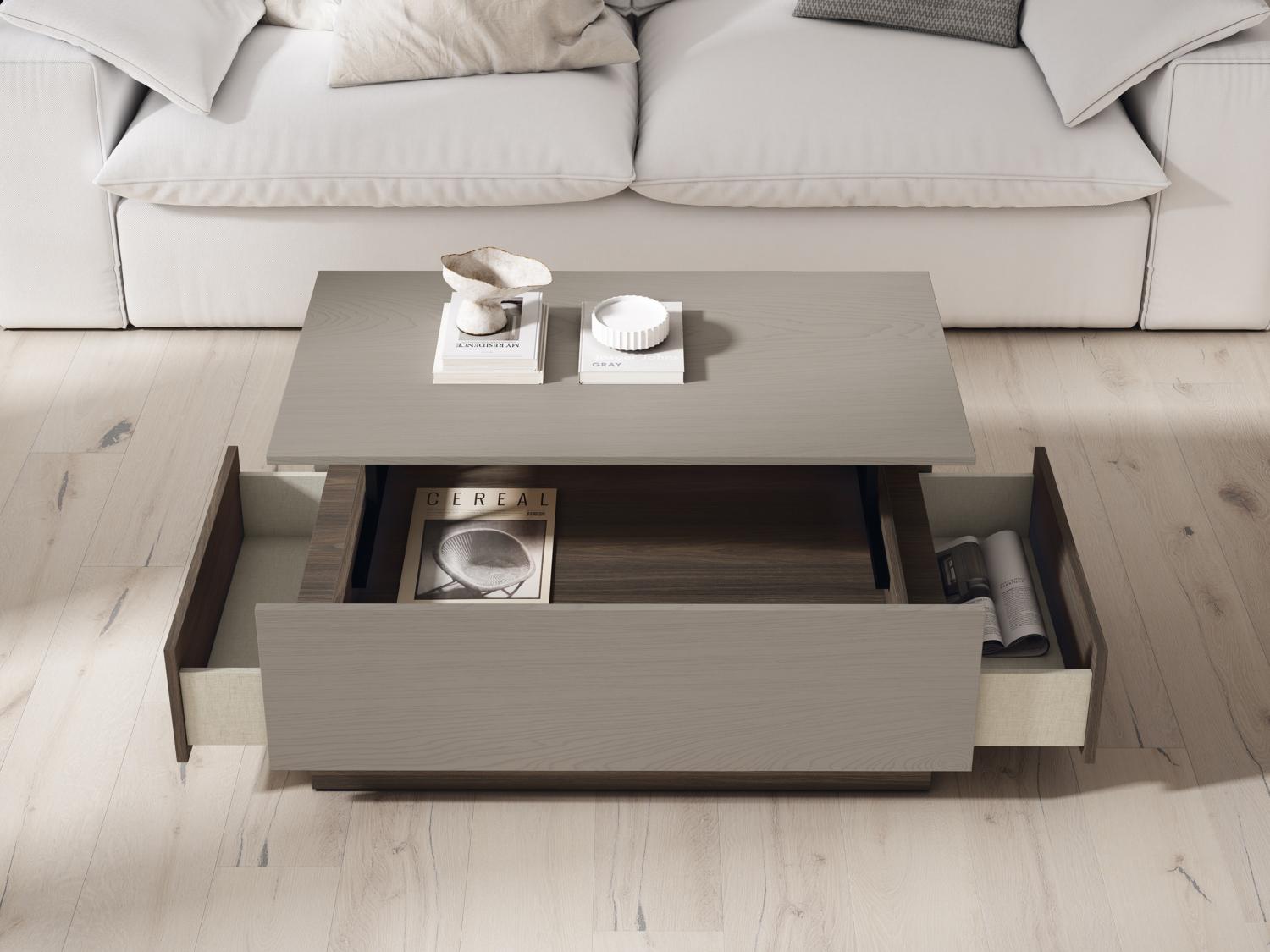 • Las mesas de centro con almacenamiento oculto permiten mantener el salón organizado y libre de desorden.